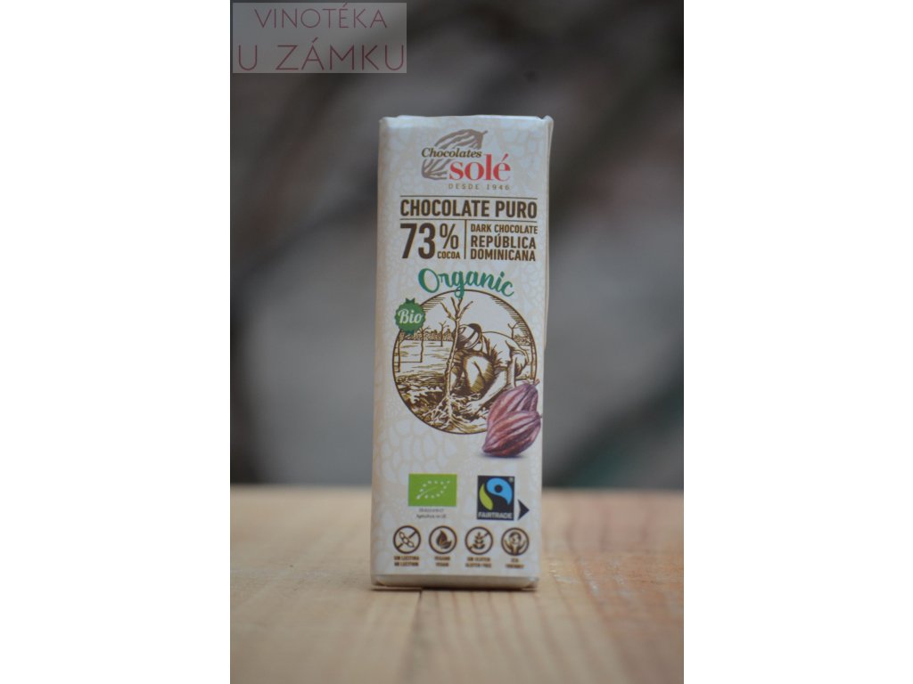 Bio Fair Trade hořká čokoláda z dominikánského kakaa a přírodního třtinového cukru z Brazílie. Ovoněná je pouze čistou vanilkou a neobsahuje žádné emulgátory. Složení: kakaová hmota, přírodní třtinový cukr, kakaové máslo, vanilka. Obsah kakaové sušiny min. 73%. Výživové údaje na 100g: energetická hodnota 2338kJ / 561kcal, tuky 35,9g (z toho nasycené mastné kyseliny 23g), sacharidy 47,6g (z toho cukr 27,1g), bílkoviny 11,8g, sůl 0,01g. Hmotnost 25g, jednotková cena 88,-Kč/100gDiskuze