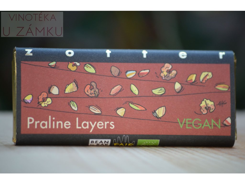 Bio, Fair trade veganská hořká čokoláda ručně plněná třemi různými nugáty tří barev . Nejdříve vrstvou nugátu z lískových ořechů (20 %), na které spočine zelená vrstva čokoládového nugátu z dýňových semínek (19 %) a na závěr něžným nugátem z vlašských ořechů (20 %). Složení : surový třtinový cukr, kakaová hmota, kakaové máslo, dýňová semínka, lískové oříšky, vlašské ořechy, slunečnicový olej, sójový prášek (sója, maltodextrin, kukuřičný sirup), sušené rýžové mléko (rýže, slunečnicový olej, sůl), olej z lískových oříšků, emulgátor sójový lecitin, nekrystalizovaný třtinový cukr, sůl, vanilkový prášek, skořice, emulgátor slunečnicový lecitin, badyán. Obsah kakaa min. 70 %, hmotnost 70g, jednotková cena 175,72 Kč/100g.Diskuze