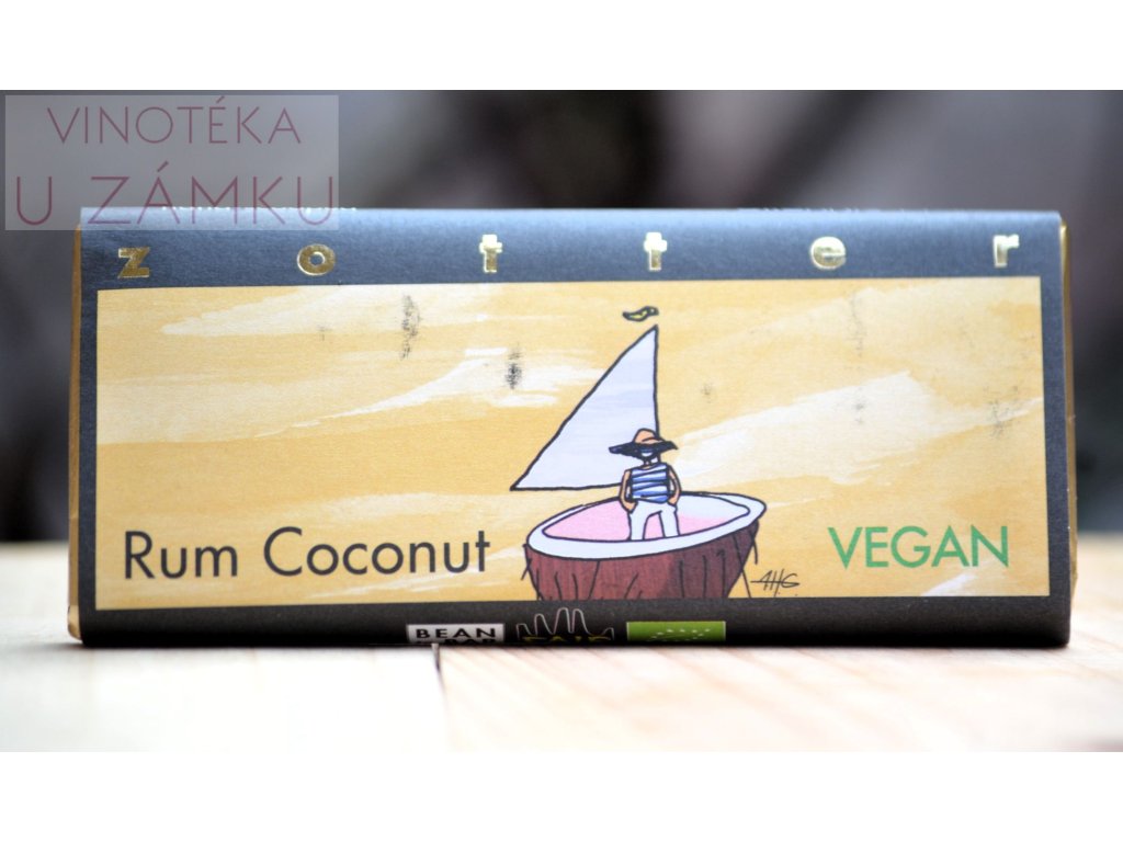 Bio, Fair trade hořká čokoláda se 70 % kakaa ručně plněná kokosovou ganache s mandlovým nugátem a ananasem a vrstvou rumového krému. Bez lepku. Složení: kakaová hmota, surový třtinový cukr, kakaové máslo, rum (6 %), invertní cukrový sirup, strouhaný kokos (4 %), sušené rýžové mléko (rýže, slunečnicový olej, sůl), kokosové mléko 3 % (kokos, voda, zahušťovadlo guma guar), MANDLE, ananasový koncentrát, škrobový sirup, kokosový prášek 1 % (kokosová pasta, kokosové mléko, kokosová mouka), nekrystalizovaný třtinový cukr, sůl, mletá vanilka, citrónový prášek (citrónový koncentrát, kukuřičný škrob, cukr), emulgátor SÓJOVÝ LECITIN, emulgátor slunečnicový lecitin, mletý zázvor. Obsahuje >2 % alkoholu. Obsah kakaové sušiny v čokoládě min. 70 %, podíl náplně 60 %. Výživové údaje na 100g: Energetická hodnota 2156kj/518kcal, Tuky 35g z toho nasycené mastné kyseliny 22g, Sacharidy 39g z toho cukry 32g, Bílkoviny 5,7g, Sůl 0,06g. Hmotnost 70g, jednotková cena 175,72 Kč/100g.