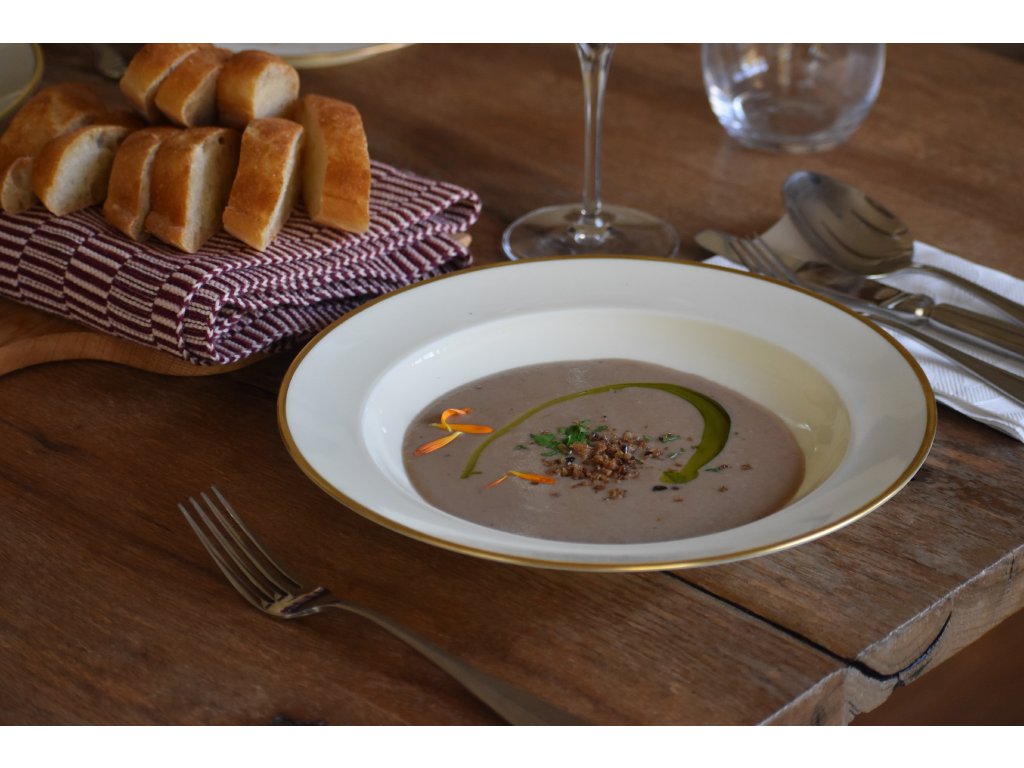 * Velouté de Chataignes au Champagne (krémová kaštanová polévka), sklenka bílého vína Fossilles 2024, Haut Marin