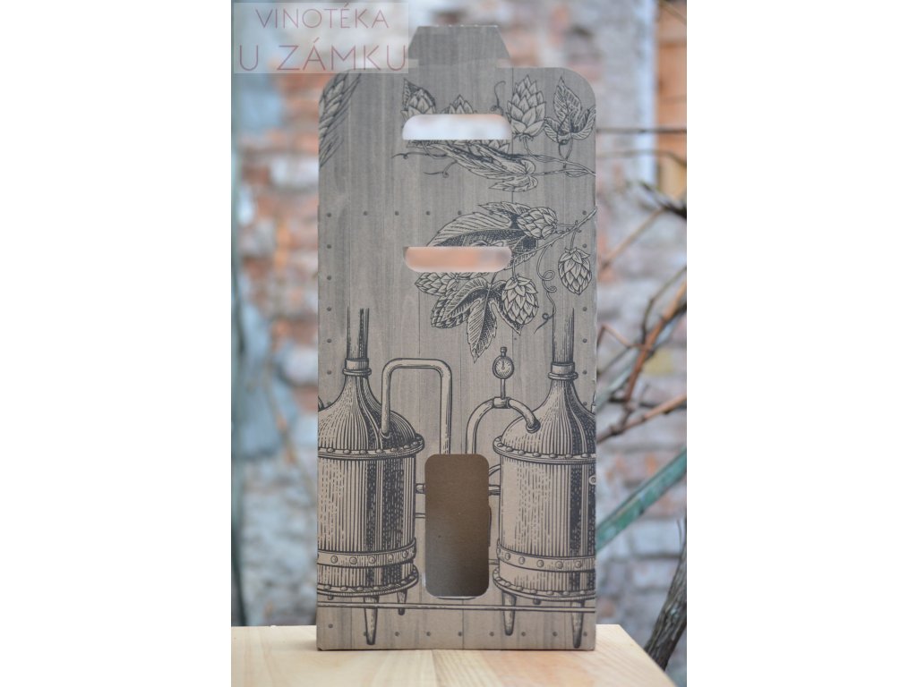 Obal z vlnité lepenky pro pohodlný přenos tří zakoupených plechovek nebo lahví o objemu 0,5l. Na obalu je stylový potisk dřeva a tematického textu o pivu. Průhledová okénka umožní náhled na etiketu lahve.