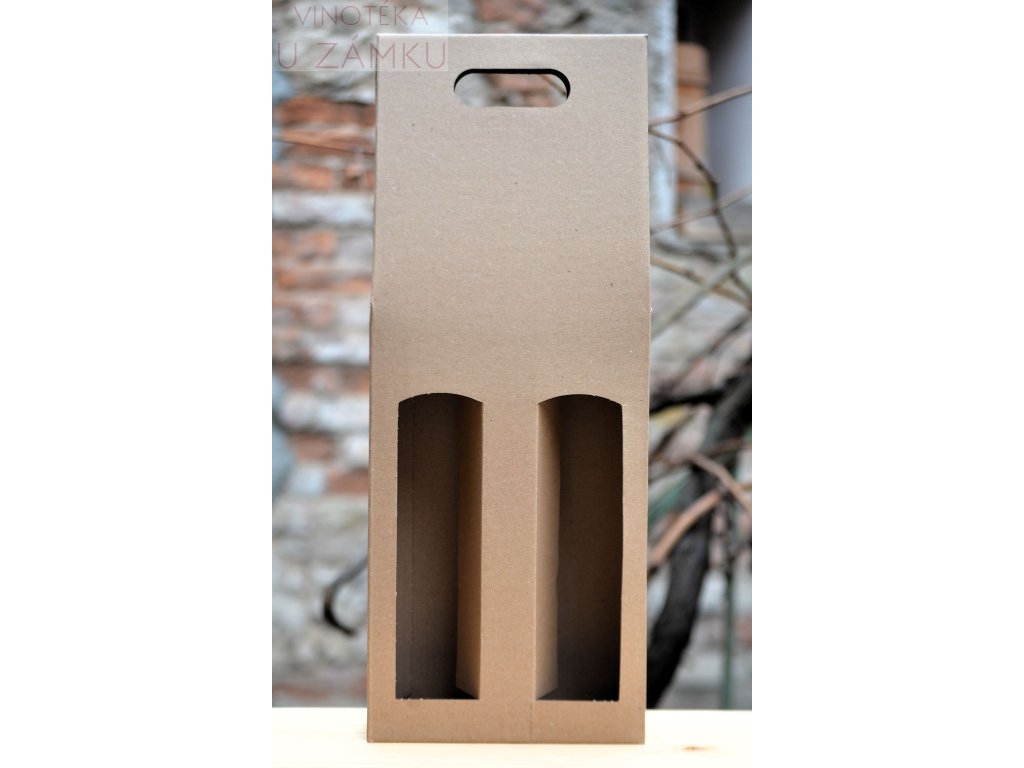 Obal na 2 láhve vína 0,75 l z třívrstvé vlnité lepenky s uchem - barva přírodní hnědá. Dárkový obal s okénkem, umožňujícím náhled na etiketu láhve. Rozměr: 164 x 80 x 400