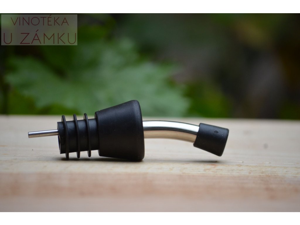 Nálevka na víno. Po zasunutí do láhve umožňuje nalévat tenkým proudem. Kombinace kov/plast.