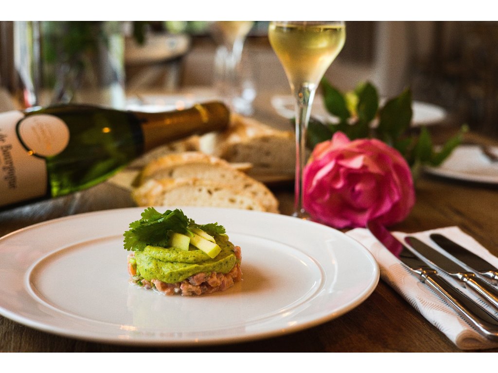 * Lososový tatarák s avokádem, naše právě upečená bageta, sklenka bílého vína Ryzlinku vlašského 2024, pozdního sběru z vinařství Mlýnek