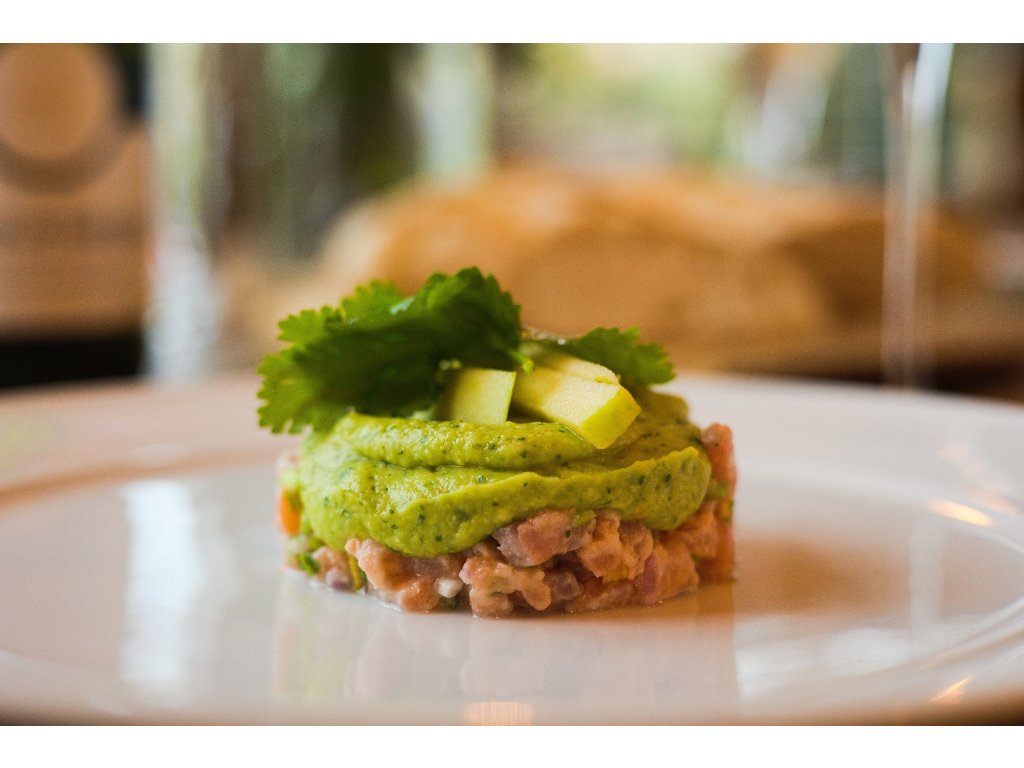 * Lososový tatarák s avokádem, naše právě upečená bageta, sklenka bílého vína Ryzlinku vlašského 2024, pozdního sběru z vinařství Mlýnek