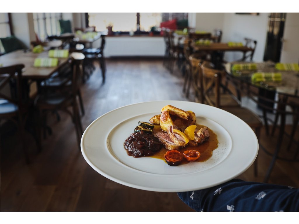 * Kachní prsa na pomerančích, karamelizovaná červená cibule, brambory, sklenka červeného vína Chateau La Fleur Fompeyre 2019 z francouzského vinařství Saint Brice