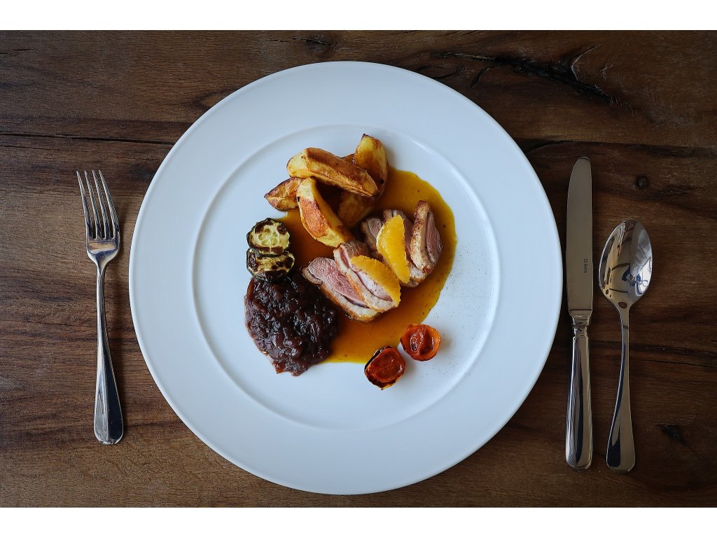 * Kachní prsa na pomerančích, karamelizovaná červená cibule, brambory, sklenka červeného vína Chateau La Fleur Fompeyre 2019 z francouzského vinařství Saint Brice