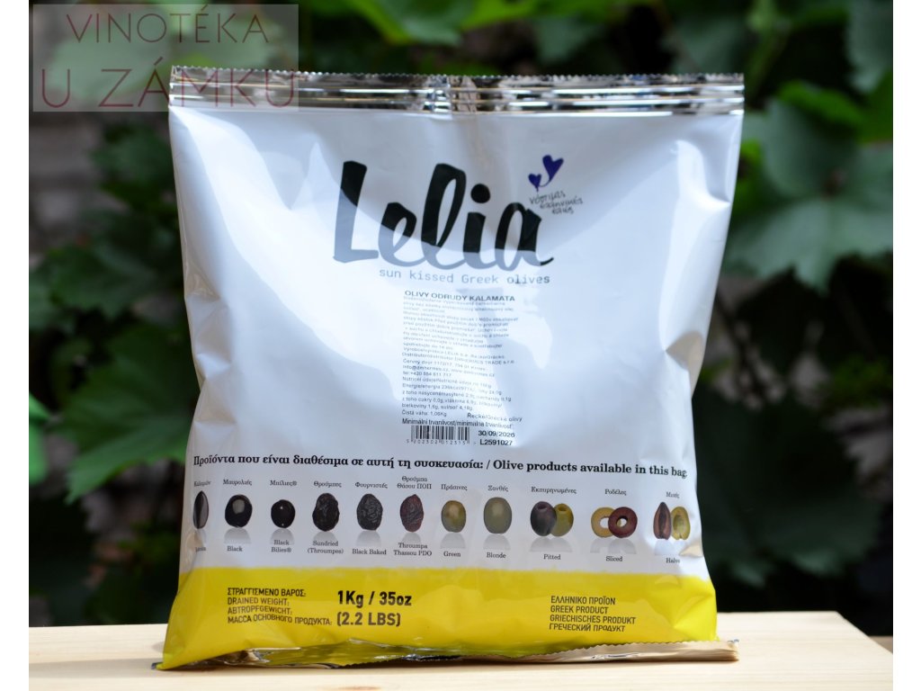 Černé olivy bez pecek z poloostrova Peloponés z oblasti Kalamata. Baleno v sáčku. Složení: černé olivy, slunečnicový olej, ocet, oregáno, sůl, kyselina sorbová. Pasterizovaný produkt, baleno ve skleněné dóze. Výživové údaje na 100g: Energetická hodnota 971kj/236kcal, Tuky 24g z toho nasycené mastné kyseliny 2,9g, Sacharidy 0,1g z toho cukry 0g, Bílkoviny 1,6g, Sůl 4,2g. Hmotnost 1kgDoplňkové parametry
