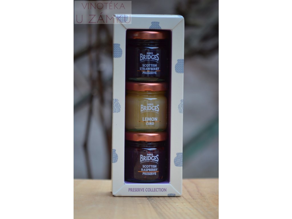 Dárkové balení džemů 3x42g. Složení: Citrónový krém: Cukr, celá VEJCE (pasterizovaná), máslo (z MLÉKA), citrónová šťáva(4%)(z koncentrátu), modifikovaný kukuřičný škrob, želírovací činidlo: pektin, citrónový olej, regulátor kyselosti: kyselina citrónová. Malinový džem: Cukr, maliny, želírovací činidlo: pektin, regulátor kyselosti: kyselina citrónová. Jahodový džem: Cukr, jahody, želírovací činidlo: pektin, regulátor kyselosti: kyselina citrónová. Hmotnost 126g, jednotková cena 115,08Kč/100gDoplňkové parametry