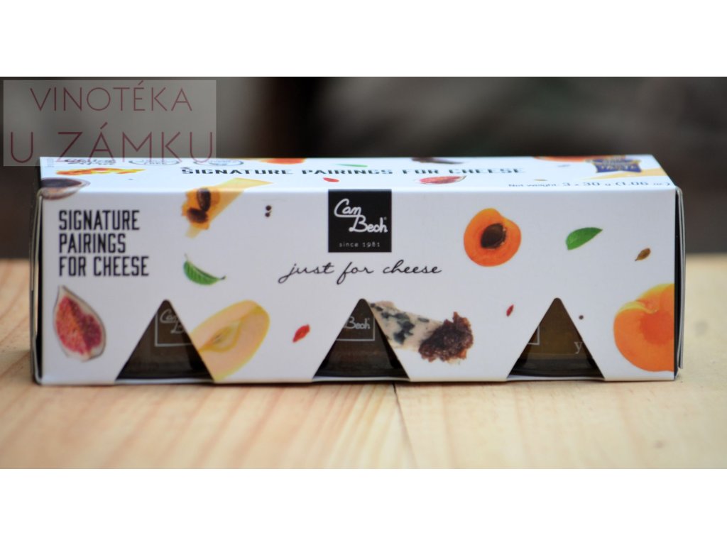 Delikátní confitury vyrobené z vybraného ovoce, ořechů a koření, balené v malých dózičkách. Ideální kombinace sladkých chutí a sýru. Jablečný confiture s tureckými pistáciemi a skořicí ze Srí Lanky - Složení: jablka Golden 72,2%, cukr, PISTÁCIE z Turecka 7,2%, citronová šťáva, skořice ze Srí Lanky 0,3%. Confiture z černých fíků s makadamskými oříšky z Austrálie a jamajským pepřem - Složení: černé fíky 60,9%, cukr, makadamiové OŘÍŠKY z Austrálie 12,2%, citronová šťáva, jamajský pepř 0,5%. Broskvovo-meruňkový confiture s lesními plody Goji a s guatemalským kardamomem - Složení: broskev 52,6%, meruňka 22,6%, cukr, ovoce Goji 3,8%, citronová šťáva a guatemalský kardamom 0,1%. Hmotnost 3x 30g, jednotková cena 136,67 Kč/100gDiskuze
