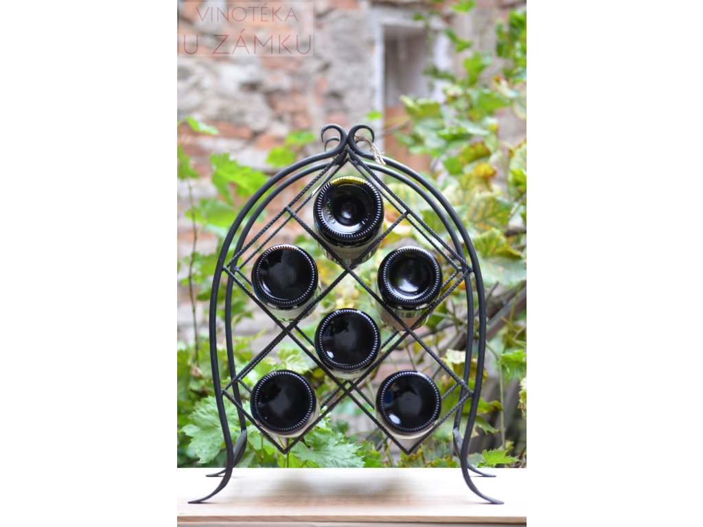 kovový, na 6 lahví, výška (cm) 44, šířka (cm) 36, hloubka (cm) 21, hmotnost (kg) 1,5. Český výrobek, ruční práce.