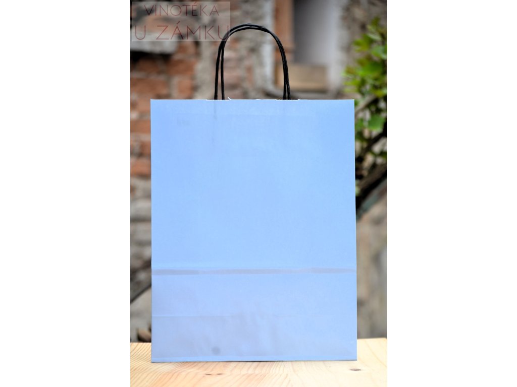 Papírová taška Toptwist světle modrá s krouceným uchem v oblíbeném rozměru 24x11x31 cm. Je ideální na menší dárky a nákupy. Svým rozměrem je také vhodná pro dokumenty A4.