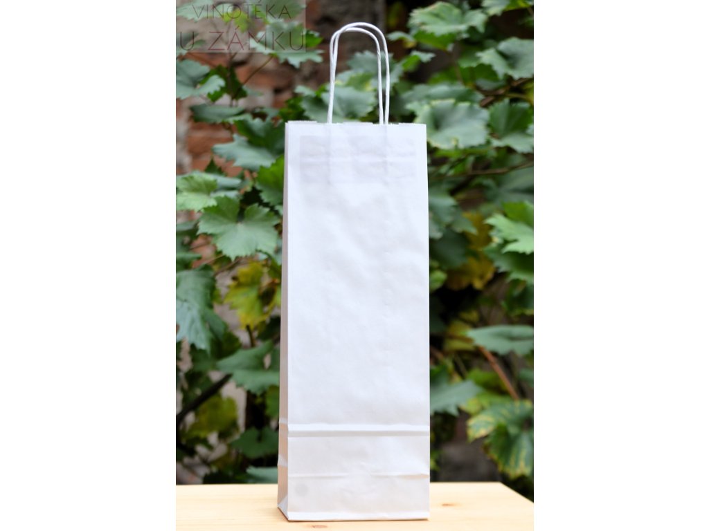 Pevná strojní taška na víno v bílém provedení s krouceným uchem z hladkého papíru. Svým rozměrem 14x8x39 cm je vhodná pro většinu lahví vína a destilátu, včetně klasických lahví sektových.