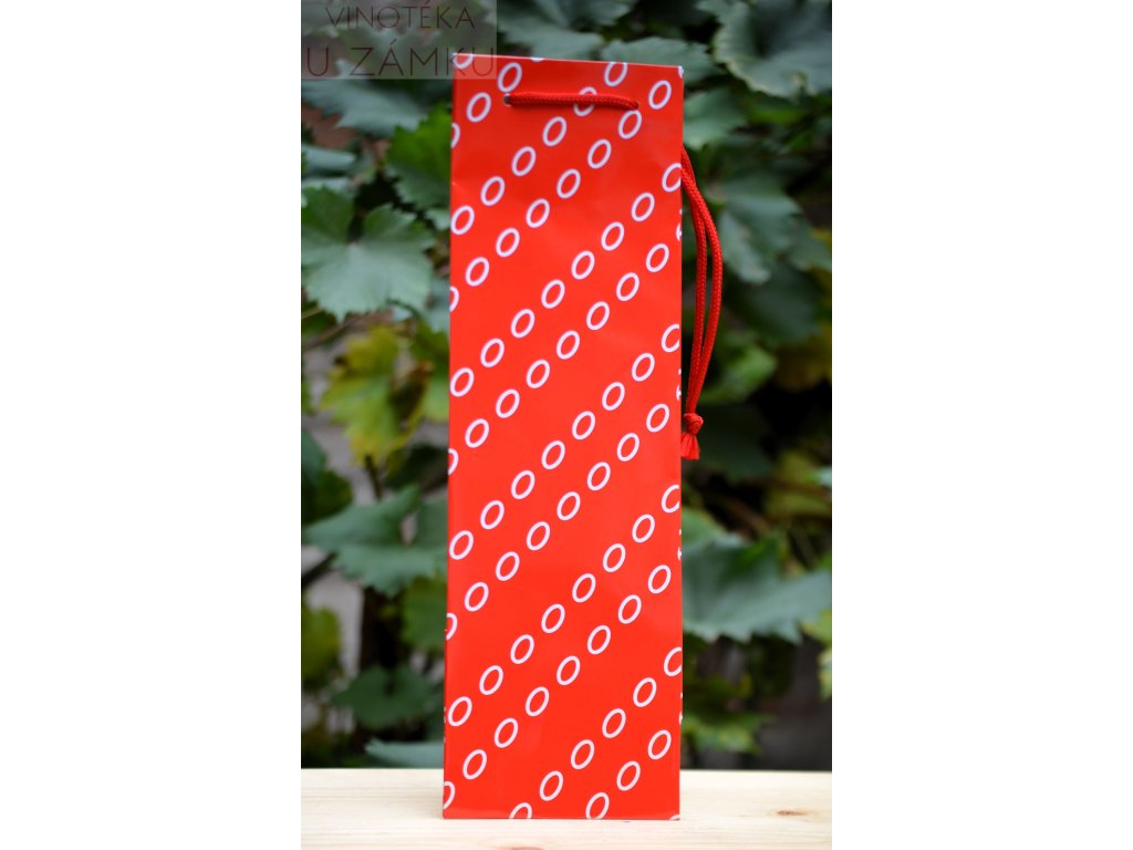 Papírová taška na 1 lahev, lesklá červená se vzorem. 37x11x9 cm.