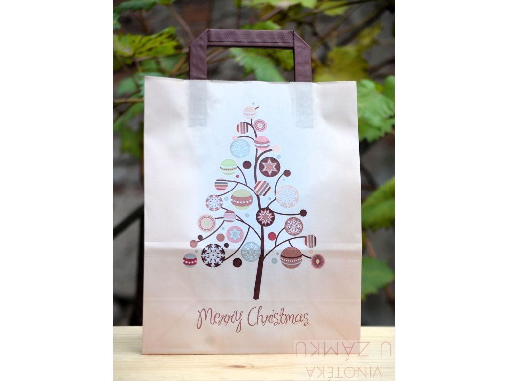 Bílá papírová taška s celoplošným vánočním potiskem. Taška má rozměr 22x10x28 cm. V tašce můžete předat větší dárek pro své nejbližší.